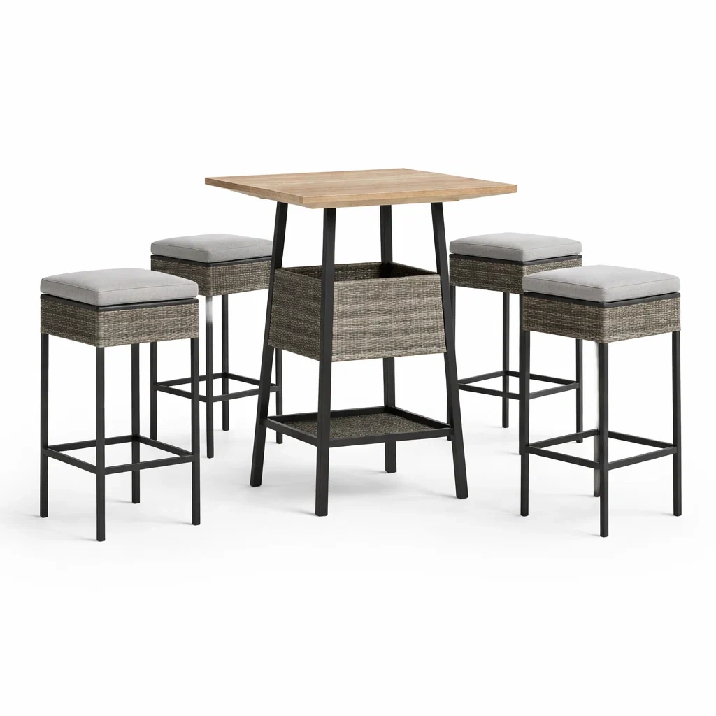Table en bois d'acacia avec pieds en acier et tabourets en résine tressée. Les coussins sont en polyester.